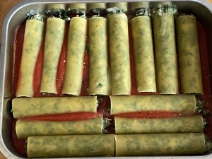 - Cannelloni vullen: Schep eenderde van de passata in een ovenschaal. Vul de cannelloni met de vulling. Dit gaat gemakkelijk met een spuitzak (of een plastic zakje waar je een puntje afknipt). Leg de gevulde cannelloni op de passata in de ovenschaal.