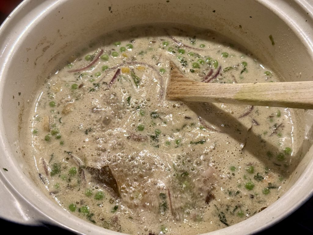 - Stamp in een vijzel de koriander, gember, knoflook en chilipepers tot een grove pasta. Zet apart.